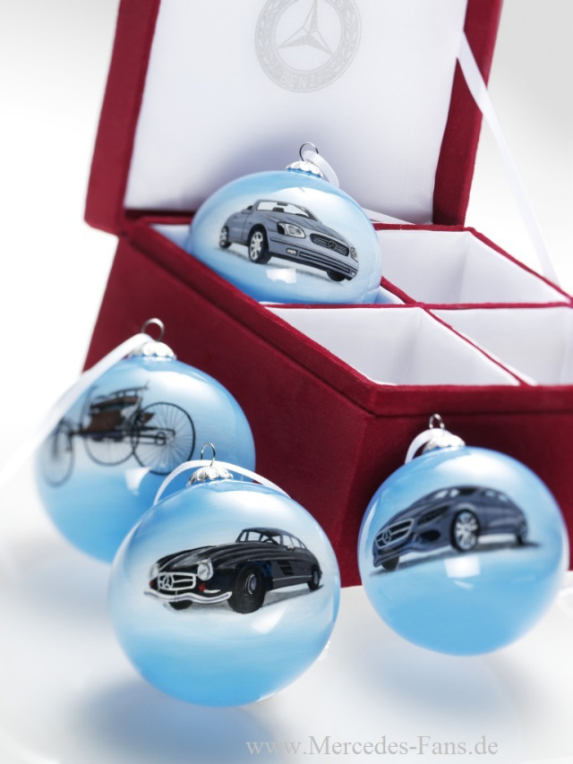 Eine Zierde für jeden Christbaum sind die neuen silberfarbenen Weihnachtskugeln der Special Edition 2012 (34,90 Euro). Das Motiv ein Rennen mit zwei Mercedes 300 SL am Nürburgring 1952 wurde von innen hinter das Glas gemalt. Die im Durchmesser rund zehn Zentimeter großen Kugeln besitzen silberfarbene Bänder und werden als 2er Set in einer mit rotem Samt bezogenen Geschenkbox angeboten.