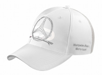 Der glitzernde Stern findet sich ebenfalls vorn auf dem dazu passenden weißen Cap für Damen mit elegantem tonalem Stick des Mercedes-Benz Motorsport Logos. Das schwarze Herren-Cap hat seitlich hellgraue Mesh-Einsätze, die bei heißen Rennszenen helfen, einen kühlen Kopf zu bewahren.