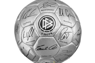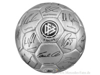 Das Runde ins Eckige lässt sich mit dem Autogrammball (29,90 Euro*) befördern. Dieser auf 2012 Stück limitierte Ball trägt die Unterschriften aller deutschen Spieler sowie die Logos von Mercedes-Benz und dem DFB. Ebenfalls die Größe 5 besitzt der Fußball in Kunstrasenoptik mit aufgedrucktem Fußballfeld und Mercedes-Stern als Mittelkreis (49,90 Euro*). Deutlich kleiner mit einem Durchmesser von rund fünf Zentimetern sind die drei Fußbälle aus Plüsch in schwarz, rot und gold (6,90 Euro*), die sich am Innenspiegel oder an der Scheibe des Autos befestigen lassen.