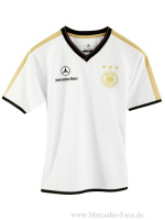 Das weiße Trikot ist im Teamwear-Stil der deutschen Nationalmannschaft gehalten und besitzt an der Vorderseite gestickte Logos von Mercedes-Benz (schwarz) und dem DFB (gold). Im Nackenbereich ist ein Deutschland-Schriftzug goldfarben gestickt. Das Unisex-Trikot aus Polyester ist für 49,90 Euro* in den Größen S, M, L, XL sowie XXL lieferbar. Für 44,90 Euro* ist auch eine designgleiche Version für Kinder in den Größen 116, 128, 140 und 156 erhältlich.