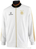 Modisch niemals ins Abseits geraten Fußball-Fans mit dem weißen Track-Jacket mit Stehkragen und goldenem Reißverschluss. Es besitzt ebenfalls die Logosticks von Mercedes-Benz und dem DFB auf der Brust sowie den Deutschlandstick im Nacken. Das Track-Jacket aus Polyester ist für 79,90 Euro* in den Größen S, M, L, XL sowie XXL erhältlich.