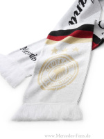 Zum Stammaufgebot zählen ferner der gewebte Fanschal in weiß mit goldenem Deutschland-Schriftzug, Mercedes-Benz Weblabel sowie dem DFB Logo an den Enden (19,90 Euro*) und die schwarze Cap aus Baumwolle mit DFB Logostick vorne und Mercedes-Benz Logostick hinten. Erhältlich ist die Cap in zwei Größen für Erwachsene und Kids für 19,90 Euro*.