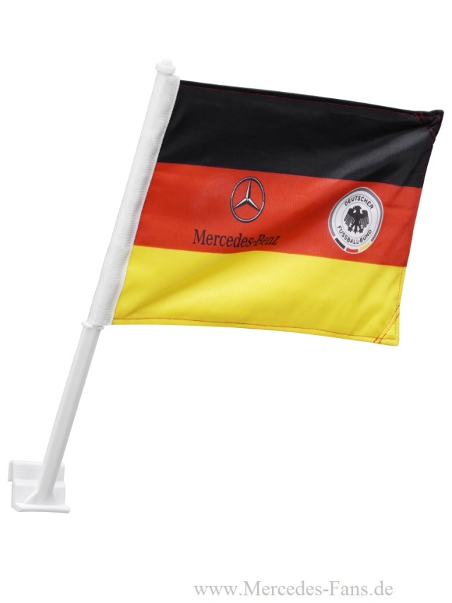 Spätestens beim Corso durch die Innenstadt darf die Autofahne in schwarz-rot-gold mit Mercedes-Benz und DFB Logodruck nicht fehlen (6,90 Euro*). Nicht nur Schlüsselspieler greifen zum weißen Lanyard aus Canvas mit gedrucktem Mercedes-Benz und DFB Logo (4,90 Euro*) oder dem Schlüsselanhänger aus schwarzem Kalbsleder (29,90 Euro*). Ein kleiner Fußball aus Edelstahl ziert dessen Vorderseite, auf der Rückseite befindet sich ein dreidimensionaler Mercedes-Benz Stern.