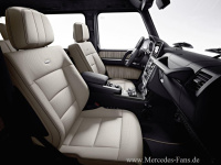 Um den Charakter der G-Klasse beizubehalten, wurden auch im Interieur stilprägende Elemente beibehalten. So verfügt die G-Klasse weiterhin über den Haltegriff auf der Beifahrerseite, die im Sichtfeld positionierten und in lackiertem Silber hervorgehobenen Schalter für die drei Differenzialsperren sowie den neu gestalteten Wählhebel in der unteren Mittelkonsole. Auf Wunsch neu mit an Bord sind die Sicherheits-Features DISTRONIC PLUS, Totwinkel-Assistent sowie die Einparkhilfe PARKTRONIC mit Rückfahrkamera. Das vollständig überarbeitete ESP® verfügt jetzt über eine Anhängerstabilisierung und eine HOLD-Funktion. Zusätzlich zur bereits serienmäßig sehr hochwertigen Innenausstattung stehen viele weitere Individualisierungsmöglichkeiten aus dem exklusiven designo-Programm zur Wahl.
