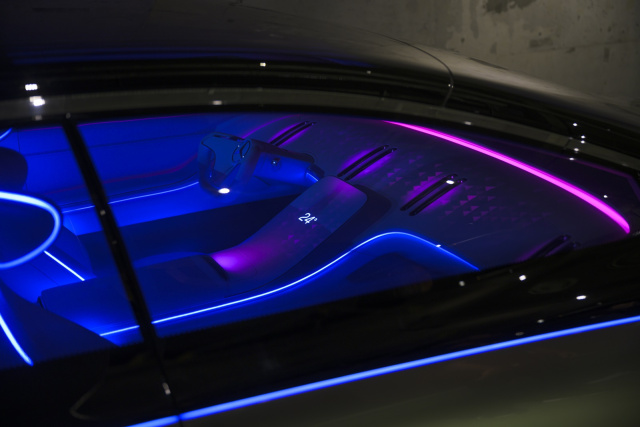 Die Karosserie selbst präsentiert sich flach und bullig, wobei die mächtigen Räder ebenso ins Gewicht fallen, wie die flächige Front mit großen Lichtmodulen in Scheinwerfern sowie Kühlergrill und ein Heckleuchtenband, das in Form von 229 kleinen Mercedes-Sternen ausgeführt ist. Angetrieben wird die allradgetriebene Studie von zwei Elektromotoren, die zusammen 350 kW / 476 PS und 760 Nm maximales Drehmoment leisten. 0 auf Tempo 100 schafft der Mercedes Vision EQS zumindest imaginär in 4,5 Sekunden und soll mit seinem im Boden verbauten Akkupaket mit rund 100 kWh eine Reichweite von bis zu 700 Kilometern realisieren.