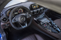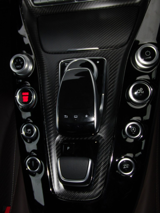 Einer dieser Knöpfe weckt den V8 Bi-Turbo. Zwei andere Knöpfe sind für die Einstellung des ESP und AMG Ride Control Sportfahrwerk. Außerdem lassen sich die Abgasanlage und der Getriebemodus einstellen. Dazu kommen zwei Basics: Die Eco Start-Stopp Funktion und der Schalter für das Multimediasystem. Der spannendste Knopf befindet sich ganz oben links: Mit einem Drehknopf lassen sich die AMG DYNAMIC SELECT Fahrprogramme einstellen. Hierbei gibt es 5 Stufen. Comfort, Sport, Sport +, Race und Individual. Im Comfortmodus ist die Gasannahme etwas ruhiger, das Fahrwerk liegt komfortabel auf der Straße und der Sound des V8 ist ruhig und voluminös. Im Sport-Modus dagegen krallt sich der GT-S schon etwas sportlicher in die Piste und der Treibsatz wird eine Spur nervöser. Sport+ lässt den AMG ziemlich straff auf dem Asphalt liegen. Jetzt sind auch die Auspuff-Klappen geöffnet und der V8 röhrt brutal und aggressiv. Das ambitionierteste Fahrprogramm ist Race. Hier wird das ESP in den Sport-Handling Mode geschaltet, die Gasannahme ist spitz wie Meiers Lumpi. Jetzt wird der Heckflügel nicht wie bei den anderen Programmen erst bei 120 km/h aus- und bei 80 km/h wieder eingefahren, sondern der GT ist nun schon ab 70 km/h beflügelt und erst bei 30 km/h zieht sich die Spoiler dann zurück. Der Race-Mode ist allerdings nur etwas für die Rennstrecke. Die Abstimmung von Motor und Getriebe ist nun für das Fahren auf der Rennstrecke ausgelegt. Die Schaltzeiten sind extrem kurz. Gut so.