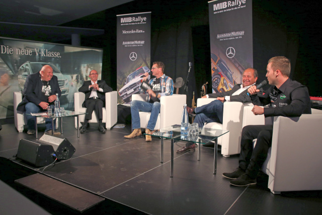 Lockere Runde zum Auftakt der Rallye (v.l.n.r.): Thomas Ebeling (Mercedes-Fans), Marcel Stadtmüller (Geschäftsführer AssenheimerMulfinger), Dirk Krühler (Moderator), Klaus Ludwig (Rennfahrerlegende) und Patrick Assenheimer (Rennfahrer)