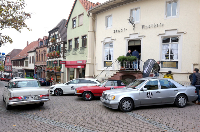 Denn besagte Apotheke gilt zugleich auch als die erste Tankstelle der Welt. Hatte doch Bertha Benz auf ihrer Fahrt von Mannheim nach Pforzheim hier Kraftstoff in Form von Ligroin nachfassen müssen. Unsere Teilnehmer mussten bei der Apotheker-Familie Suchy nicht nur gutes Schätzvermögen beweisen, sondern sich auch noch eine Dose MIBroin sichern. Das Kaffee-Mixgetränk hatte das Mercedes-Benz Gebrauchtteile Center beigesteuert. Jedenfalls war der Marktplatz an diesem Sonntag komplett in der Hand zahlreicher Mercedes-Fans – sowohl als Teilnehmer wie auch als Zuschauer.
