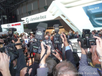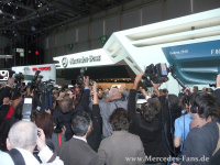 Aber etwas muss dran gewesen sein an der Präsentation: plötzlich stürmten Hunderte an Journalisten die Bühne. Wie von einem Magnetfeld angezogen, strömte alles was eine Kamera in der Hand hatte zur Bühne. Während sich Kollege Frankenstein nach vorn kämpfte, um ein vernünftiges Bild der Mercedes-Benz Repräsentanten schießen zu können, wühlte sich der Chronist wieder aus dem Gewusel (rechts, unbedingt anklicken!!!) heraus, um das Gedränge zu fotografieren.