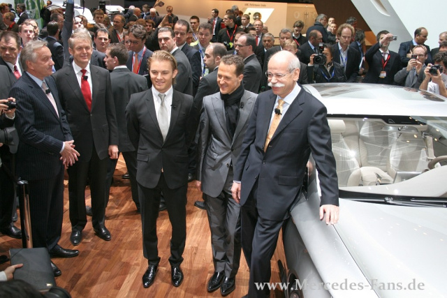 So etwas hatte der Chronist in seinen mehr als 2o Jahren journalistischer Tätigkeit auch noch nicht erlebt. Fünf Männer lösen eine wahre Foto-Mania aus, die in dieser Form auf dem Genfer Salon bis dato wohl eher unbekannt war. Selbst Arnold Schwarzenegger erzeugte bei seiner Stippvisite im letzten Jahr weniger Blitzlichtgewitter als Dr. Dieter Zetsche, Michael Schumacher, Nico Rosberg, Marketingchef Dr. Joachim Schmid und Entwicklungsvorstand Dr. Thomas Weber. Diese fünf waren bei der Presse Trümpf - und andere zeigten sich deswegen etwas verschnupft....