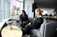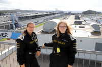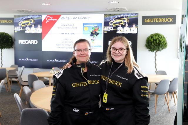 Kurz vor dem geplanten Start ging es für die beiden Mädels in die Umkleide. Hier erhielten sie ihre Rennausrüstung, bestehend aus einem feuerfesten Rennoverall sowie entsprechendem Schuhwerk. Sicherheit geht vor, schließlich handelt es sich bei der Nordschleife um eine der gefährlichsten Rennstrecken der Welt, die auch bei Taxifahrten im absoluten Renntempo umrundet wird. Unten in der Black Falcon Box konnten sich die beiden im Anschluss einen ersten Eindruck vom Ablauf machen. An diesem Tag schleuste das Team Black Falcon über 40 Taxigäste durch, die sich auf sechs Renntaxis - allesamt echte Rennfahrzeuge - verteilten. Standesgemäß wurden unsere MIB-Mädels dem Mercedes-AMG GT4 im kultigen "Knuffi"-Design zugeteilt. Dieses Fahrzeug gewann übrigens am Folgetag den VLN-Lauf in seiner Klasse!