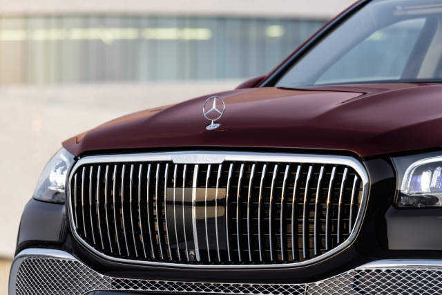 Der Mercedes-Benz Stern thront klassisch auf der Motorhaube, die feinen vertikalen Chromstreben des Maybach Kühlergrills wirken wie Nadelstreifen. Wirkungsvolle Chromakzente um die Seitenscheiben und die Chromeinleger in den Seitenschwellern lassen das Profil edel und elegant wirken. Die 22 oder 23 Zoll großen Räder wurden exklusiv für dieses Modell entworfen, die 23-Zoll-Ausführung zitiert das Nadelstreifen-Motiv. Die Endrohrblenden mit kleinem Quersteg betonen die Mercedes-Maybach Identität. Gleiches gilt auch für das Markenemblem, das an verschiedenen Stellen wie der D-Säule platziert wurde. Als Maybach-spezifische Besonderheit ist eine Zweifarblackierung in acht verschiedenen, eleganten Farbkombinationen erhältlich.