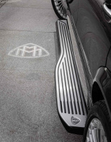 sind die elektrisch ausfahrbaren Trittbretter. Sie machen das Ein- und Aussteigen aus der hohen Sitzposition komfortabel und sicher. Mit Trittflächen aus eloxiertem Aluminium, die von schwarzen Gummilamellen durchzogen, bei Dunkelheit beleuchtet und im Bereich der Fondtüren besonders breit sind, sorgen sie für eine besondere Inszenierung. Im eingezogenen Zustand verbergen sich die Trittbretter in der Verkleidung der Schweller. Wird eine Fondtüre geöffnet, senkt sich der Wagen leicht ab (!) schwenkt das Trittbrett auf der jeweiligen Seite in etwa einer Sekunde automatisch nach außen. Diese Voreinstellung kann durch ein spezielles Menü im MBUX Infotainmentsystem geändert werden. Zugunsten des Raumangebots im Fond ist der Mercedes-Maybach GLS ausschließlich mit zwei Sitzreihen erhältlich.