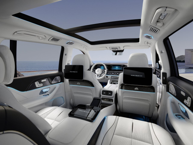 Die Ausstattung des Mercedes-Maybach GLS 600 4MATIC ist bereits serienmäßig ausgesprochen luxuriös. Die beiden hinteren äußeren Sitze lassen sich elektrisch in Ruhesitze verwandeln. Die Polster und die Instrumententafel sind serienmäßig mit feinem Nappaleder bezogen, auf Wunsch gibt es eine Reihe zusätzlicher Kissen und noch mehr Lederbezüge auf den Innenverkleidungen. Ein elektrisch öffnendes Panorama-Schiebe-Hebedach mit blickdichter Jalousie muss ebenso wenig zusätzlich bestellt werden wie klimatisierte Massagesitze. Als Sonderwunsch bestellbar ist beispielsweise die feste Mittelkonsole, die aus dem Wagen einen geräumigen Viersitzer macht, in dessen Fond man genauso gut arbeiten wie entspannen kann. Für diese Konsole gibt es auf Wunsch ausfahrbare Klapptische, aber auch einen Kühlschrank mit Platz für Champagnerflaschen. Über das Zubehörprogramm sind hierfür passende Kelche aus Silber verfügbar.
