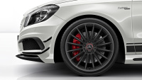 Nein, ganz im Ernst. Der A45 AMG kommt hier nicht im Halbstarken-Look, sondern zeigt der Außenwelt selbstbewusst, was vielleicht nur Eingeweihte einer A-Klasse zutrauen: Das Leistungspotenzial auf Niveau eines Super-Sportwagens gefangen im Körper eines Kompakten. So gesehen sind auch die Flipper, Spoiler und Splitter nicht nur für den Groundeffekt gut, sondern auch für den Respekteffekt. Einen bleibenden Eindruck hinterlassen auch die roten Akzente am Kühlergrill, Heckflügel, den Außenspiegeln und Bremssätteln. Die mattschwarz lackierten 19"-AMG Leichtmetallräder im Vielspeichen-Design mit speziellen AMG Radnabenabdeckungen sind mit rundum mit 235/35 R19er Hochleistungsreifen gummiert.