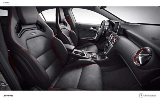 Auch im Interieur des A 45 AMG Edition 1 dominieren die Farben Schwarz und Rot. Die AMG Performance Sitze in Ledernachbildung ARTICO/Mikrofaser DINAMICA zieren ebenso rote Kontrastziernähte wie das Oberteil der Instrumententafel in Ledernachbildung ARTICO und das AMG Performance Lenkrad in Leder Nappa/Mikrofaser DINAMICA. Weitere optische Glanzpunkte sind der E-SELECT Wählhebel mit geprägtem AMG Wappen und die Edition 1 Plakette auf der AMG DRIVE UNIT.