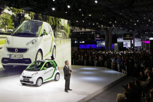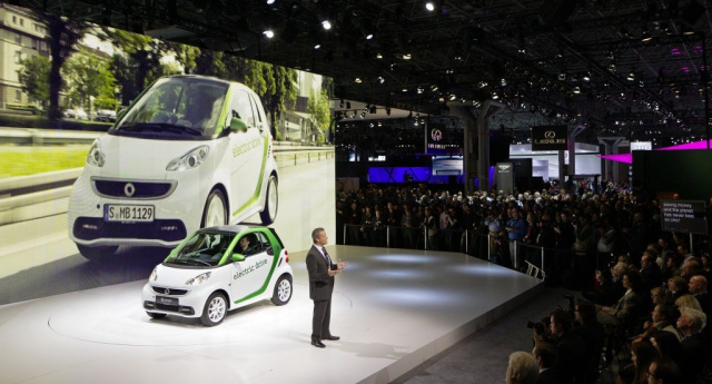 Stephen Cannon, Präsident und CEO der Mercedes-Benz USA, mit dem smart fortwo ed bei der Mercedes-Benz Pressekonferenz in New York.