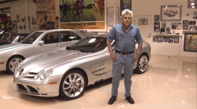 Dass TV-Star Jay Leno ein Auto-Narr ist, ist bekannt. In der Reihe "Jay Leno's Garage" zeigt der US-Talkshow-Veteran und Comedian gerne, was er hat. In der Filmreihe ist jetzt auch ein etwas mehr als zwölfminütiger Beitrag zum Mercedes-Benz SLR McLaren, den Jay Leno ebenfalls sein eigen nennt, erschienen. Das Bemerkenswerte an dem Video ist darüber hinaus, was an Mercedes-Benz Devotionalien alles in Lenos Garage steht. Ein richtiges Wimmel-Bild für Mercedes-Fans ist das Video, in dem es zum Beispiel auch den ersten WM-Pokal von Juan Manuel Fangio zu entdecken gibt, der heute zu den kleinen Schätzen des Mercedes-Benz-Enthusiasten Jay Leno gehört. Sehen Sie selbst:
