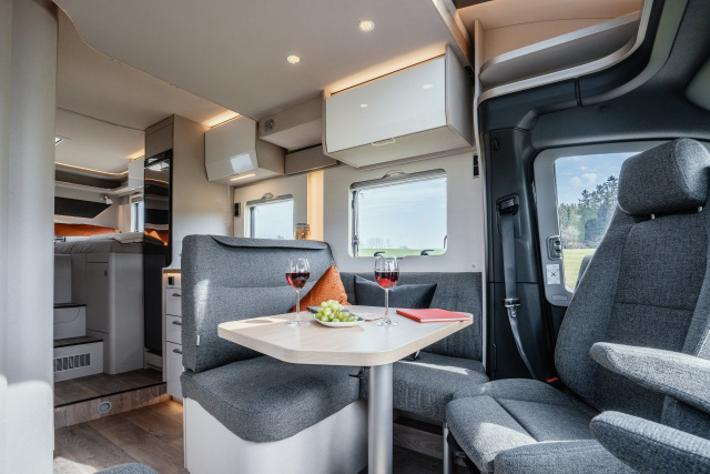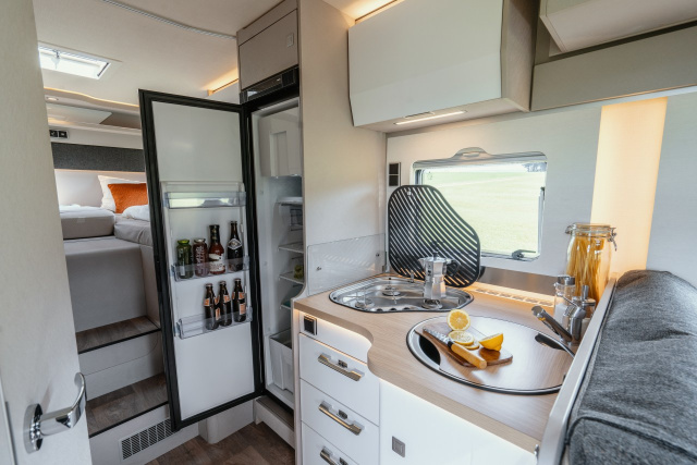 Weiterhin vorhanden sind die beiden kompakten 2,75 Kilogramm-Gasflaschen für den Herd und zum Kochen. Erstmalig bietet sich zudem die Option, die Stahl-Doppelblattfeder auf der Hinterachse des Fahrzeugs mit einer GFK-Blattfeder zu tauschen, wodurch zusätzliche 16 Kilogramm eingespart werden können. Der große Panorama-Dachlüfter im Wohnbereich lässt viel direktes Tageslicht herein und schafft damit angenehme, natürliche Lichtverhältnisse im Fahrzeuginneren.