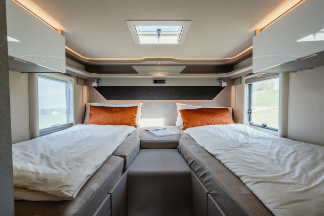Ein besonderes Highlight des Tramp S 585 ist das komplett überarbeitete und für den Grundriss optimierte Vario-Schwenkbad. Es lässt sich mittels variabler Schwenkwand ganz einfach zu einem ergonomisch gestalteten Design-Bad erweitern – damit wird der kompakte Raum ideal genutzt. Für Komfort im Wohnbereich sorgt neben den verstellbaren Mercedes-Benz Komfortsitzen, die einen halben Meter breite Seitencouch. Sie kann optional auch mit einem 5. Sitzplatz ausgestattet werden. Darüber hinaus ist als Sonderausstattung auch eine Komfort-L-Sitzgruppe mit Loungepolstern wählbar. Teil der umfangreichen Serienausstattung des Tramp S 585 ist der raumhohe Kleiderschrank. Zusätzlicher Stauraum findet sich unter den zwei Längseinzelbetten mit einer serienmäßigen Länge von 1,93 und 1,87 Metern. Sportliche Akzente im Äußeren setzt die im Rahmen der Sonderausstattung verfügbare Tenorit-Designabklebung.