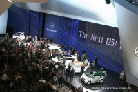 Die in die Zukunft gerichtete Offenheit von Mercedes Next und die in Tradition geerdete Souveränität von 125 Jahren Mercedes-Benz vertieft die dreigeschossige Produktausstellung jenseits der Bühneninszenierung. Aus dem Eingangsbereich der Festhalle gelangen die Besucher über eine Rolltreppe auf der Südseite auf Ebene 2 des Messestandes. Von dort führt ein knapp 650 Meter langer Rundgang über die terrassenartige Bebauung zurück ins EG. Die Besucher haben dank des kurzen Abstandes zwischen Bühne einerseits sowie Parkett und terrassenförmigen Rängen andererseits nahezu während des gesamten Rundgangs über den Messestand einen optimalen Blick auf die Bühne. Ganzglas-Geländer, lange Kanten und eingebaute Sitzstufen über alle Ausstellungsebenen hinweg eröffnen immer wieder neue Blickachsen und Wahrnehmungssituationen. Der Besucher kann pendeln zwischen Show und Information. Auf allen drei Ebenen finden die Besucher in klar gegliederten und übersichtlichen Themenbereichen Fahrzeuge, Exponate und Explainer-Stationen.