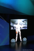 Die Wirkung der kinetischen Medienflächen wird besonders spürbar bei der Premiere der neuen M-Klasse. Bewegte Landschaftsbilder auf Vorder- und Hintergrund sowie dem LED-Boden erzeugen einen dynamischen Raum, in dem die M-Klasse fährt. Im Schlussbild fährt die M-Klasse aus der Tiefe des Raums durch die geöffnete Medienfläche auf eine Drehscheibe. Gleichzeitig wechselt die Bespielung aller LED-Ebenen: von horizontalen Landschaftsbildern zu vertikalen Stadtbildern. Die Inszenierung transportiert die M-Klasse bildlich von der Bühne in das Auditorium der Festhalle. Ergänzt werden die Fahrzeugpräsentationen durch das Editorial 125! Jahre Innovation. Es stellt den Zukunftsausblick von Mercedes-Benz in den Zusammenhang von 125 Jahren Innovation.