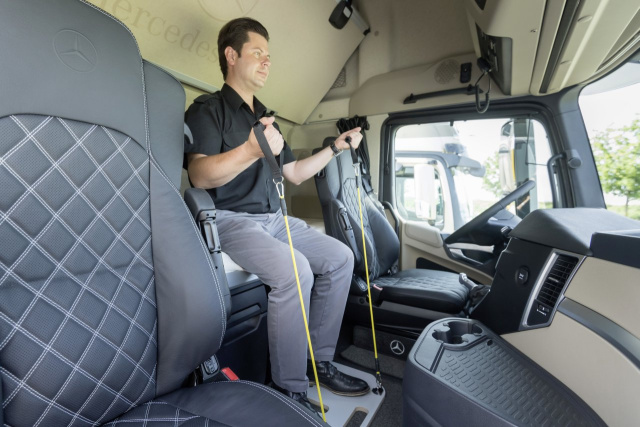 Klimaautomatik und Kühlschrank, Soundsystem und das große Display in der Armaturentafel, Drucklufthorn und Ablagenschale auf der Armaturenbrüstung steigern die Funktionalität und den ohnehin hohen Komfort des Actros sowie die Fahrfreude nochmals. Mit Unterstützung des serienmäßigen Top-Fit Sets befindet sich der Fahrer in ebenso guter körperlicher Verfassung wie sein Jubiläums-Truck. Mit dem Sport- und Fitness-Set lassen sich die durch den Fahrerberuf stark beanspruchten Körperpartien kräftigen, trainieren und therapieren. Das Set wurde gezielt für die Anwendung in der Lkw-Kabine entwickelt und konzipiert. Es besteht aus einem Board aus stabilem Schicht holz, an dem sich die Übungsbänder, so genannte Tubes, mit Karabinerhaken befestigen lassen.