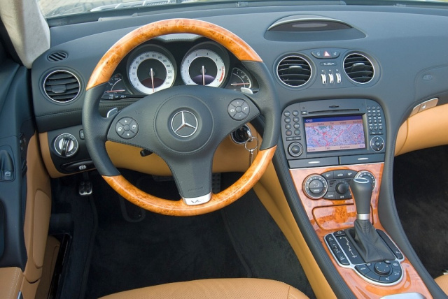 Der Geruch des fein verarbeiteten und elegant tonfarbenen Nappa-Leders passt zu einem Roadster dieser Klasse. Edle Hölzer hier ein sehr klassisch anmutendes Wurzel-Furnier und gekonnte Chrom-Akzente supern das von zwei gut ablesbaren Rundinstrumenten dominierte Armaturenbrett, Türverkleidungen und das Lenkrad. Die Verarbeitung erfüllt höchste Ansprüche, die Gestaltung beflügelt die Fantasie. Willst du mit Schlüssel starten, oder mit Druck auf den Anlasserknopf des Automatikwählhebels?