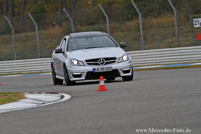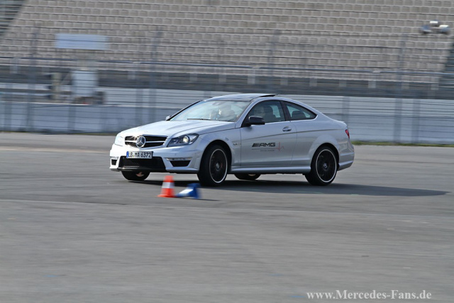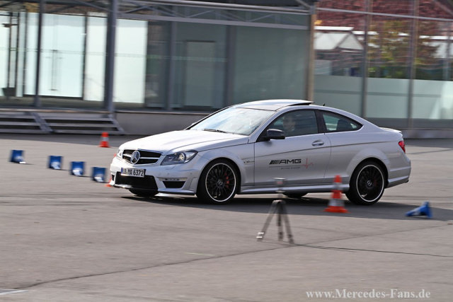 Blitzschnell startet das C63 Coupé durch den Slalomkurs. Die Conti-Reifen bewegen sich hart an ihrer Grenze und sorgen dafür, dass der Mercedes die Bodenhaftung nicht verliert. Der Fahrer zirkelt das Coupé durch´s letzte Pylonenpaar und legt eine saubere 180°-Wende auf den Asphalt. Am Steuer sitzt nicht etwa ein Rallyepilot, sondern der Gewinner des AMG Driving Academy Advanced-Fahrtrainings, der 20-jährige Joschka Busch aus Wuppertal und lacht verschmitzt: "Am C63 mag ich seine Wendigkeit und das agile Ansprechverhalten des Motors. Genau das Richtige für mich!"