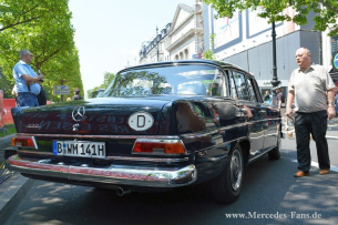 Auch der Tod wurde nicht vernachlässigt: Ein 220D-Stricher Leichenwagen von Swoboda-Karosserie mit rostiger Sense auf dem Dachgepäckträger. Die Flut der 123er und 111er wurde von diversen S-Klassen und SL verschiedener Baureihen garniert.
