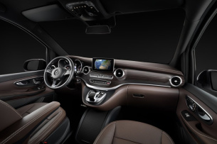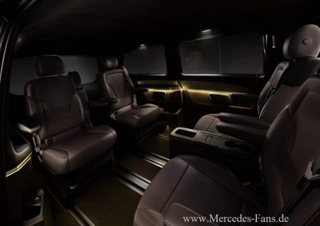 Edel mit Ambientebeleuchtung illuminiert wird der Innenraum der V-Klasse erstrahlen. Mit zahlreichen Innovationen, wie der aktiven Sitzbelüftung mit reversierenden Lüftern, der separat zu öffnenden Heckscheibe und einer zweiten Ladeebene, wird die V-Klasse in ihrem Segment neue Standards bei Komfort und Variabilität setzen. Das Innenraumkonzept erfüllt die individuellen Ansprüche der unterschiedlichen Zielgruppen. Ob für Familie, Business oder Freizeit die V-Klasse eröffnet eine einzigartige Vielfalt und Unabhängigkeit bei der Nutzung einer Großraumlimousine.