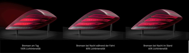 Steht der Mercedes Fahrer beispielsweise bei Nacht an einer roten Ampel auf der Bremse, wird die Helligkeit des Bremslichts automatisch heruntergeregelt, sodass der Hintermann nicht geblendet wird. Über eine homogene Lichtverteilung wird das Licht den Umgebungsbedingungen angepasst. Selbstverständlich ist sichergestellt, dass alle gesetzlichen Anforderungen erfüllt bleiben.