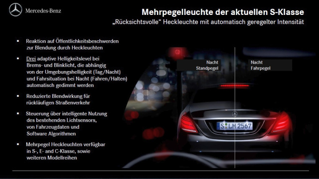 Mercedes-Benz hat bei den Heckleuchten mit der Mehrpegelfunktionalität 2013 eine Weltpremiere realisiert, die bis heute ein Alleinstellungsmerkmal geblieben ist: Bremslicht und Blinker werden je nach Fahrzustand und der Helligkeit des Umfeldes (Tag/Nacht) mit unterschiedlicher Intensität betrieben. LED-Heckleuchten mit automatisch geregelter Intensität sind gleich in mehrfacher Hinsicht ein gutes Beispiel für die „Real Life Safety“-Philosophie von Mercedes-Benz: Die innovative LED-Weiterentwicklung sorgt für bestmögliche Lichtperformance, ohne dass andere Verkehrsteilnehmer geblendet werden. Entsprechend positiv bewertet werden die LED-Heckleuchten bei Vergleichstests der Motorpresse und von Automobilclubs.