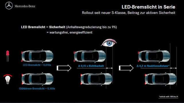 LED-Bremsleuchten leisten einen wesentlichen Beitrag zur Verkehrssicherheit und werden u.a. auch deshalb seit der neuen C-Klasse serienmäßig in allen neuen Baureihen eingesetzt. Durch ihr schnelleres Ansprechen (0,010 Sekunden - herkömmliche Glühlampen 0,160 Sekunden) werden nachfolgende Autofahrer früher gewarnt. Die Reduktion der Ansprechzeit von 0,15 Sekunden bedeutet bei einer Geschwindigkeit von 100 km/h eine Verkürzung des Anhaltewegs um 4,2 Meter.