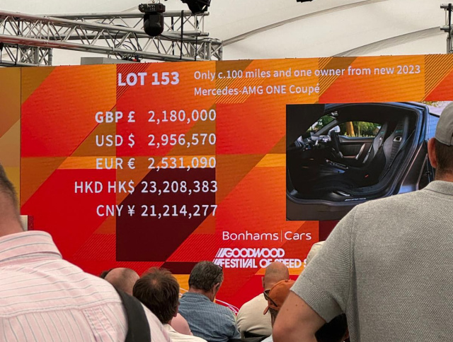 Beim diesjährigen Goodwood Festival of Speed, einem der renommiertesten Events für Sammlerfahrzeuge, wurde ein AMG ONE versteigert – zum Preis von 2.531.000 Euro inklusive Mehrwertsteuer. Dieser Wert liegt unter dem ursprünglichen Brutto-Listenpreis des Fahrzeugs und überrascht Branchenkenner. Für ein Fahrzeug, das aufgrund seiner Limitierung und Technik als künftiger Klassiker gehandelt wurde, ist das ein erstes Warnsignal. Szene-Kenner und Oldtimer-Spezialist Thomas Rosier hat dazu folgende Anmerkung: "In dem Fall des Auktionergebnisses vom ONE ist es so, dass zu den 2,5 Millionen auch das Premium an Bonhams zu zahlen ist. Damit liegt der Verkaufserlös bei 2,85 Millionen €. Darüber hinaus gilt dieser Preis nur für den Erwerber in Großbritannien! Für den potentiellen Käufer im Ausland sind jeweils die Zoll- und Umsatzsteuergebühren zuzurechnen. in dem vorliegenden Fall wären also auf 2,85 Millionen € bei Import nach Deutschland 10 % Zoll sowie 19 % Mehrwertsteuer zu entrichten."