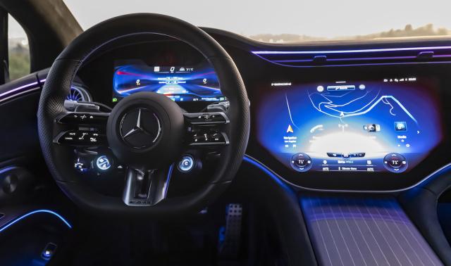 Dabei verschlagen einem die Fahrleistungen des EQS-AMG nicht nur beim visuellen Erstkontakt die Sprache, obwohl er nicht die prestigeträchtige 63er-Nomenklatur am Heck tragen darf. Die beiden Elektromotoren an Vorder- und Hinterachse leisten üppige 484 kW / 658 PS und ein maximales Drehmoment von 950 Nm. Als ob das nicht sportlich genug wäre, gibt es mit dem Dynamic-Plus-Paket einen stattlichen Nachschlag auf 560 kW / 761 PS und bis zu 1.020 Nm. Der Schub ist aus dem Stand ebenso wie aus nahezu jeder anderen Geschwindigkeit nicht mehr als gewaltig zu bezeichnen. Ein Tritt aufs rechte Pedal lässt einem beinahe die Gesichtszüge entgleisen und presst die Insassen unvermittelt in die sehr guten Ledersitze als wäre man in einem Formel-Renner unterwegs. Das Problem dabei: im normalen Fahrbetrieb und selbst deutlich darüber hinaus ist der AMG-Unterschied zum alles andere als schlapp motorisierten Mercedes EQS 580 4MATIC kaum spürbar. Ein Muss: der serienmäßige Allradantrieb, der die Antriebsmomente je nach Fahrsituation variabel zwischen Vorder- und Hinterachse verteilt. Das Drehmoment wird 160-mal pro Sekunde gemessen und bei Bedarf gestellt.