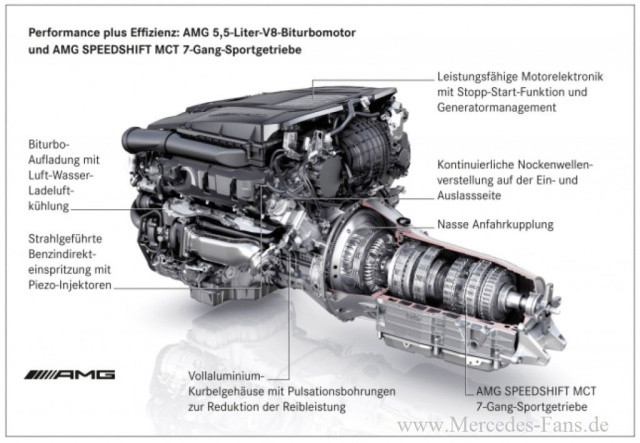 Dass man den Spritverbrauch drastisch reduzieren kann, ohne dabei Abstriche am dynamischen Fahrerlebnis machen zu müssen, führt AMG mit seinem neuen 5,5 Liter V8 vor. Im Sommer 2010 geht das Biturbo-Aggregat mit einer Höchstleistung von bis zu 420 kW (571 PS) und einem Drehmoment von bis zu 900 Nm an den Start. Der neue, Achtzylinder beeindruckt mit einer Fülle technologischer Highlights wie Benzin-Direkteinspritzung mit strahlgeführter Verbrennung und Biturboaufladung.