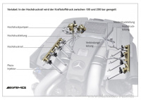 Mercedes-AMG präsentiert mit der Kombination Biturboaufladung und Benzin-Direkteinspritzung mit strahlgeführter Verbrennung ein attraktives Hightech-Paket. Die innovative Einspritztechnik bringt entscheidende Vorteile beim Kraftstoffverbrauch und den Abgas-Emissionen. Der Grund liegt im höheren thermodynamischen Wirkungsgrad. Besonders schnelle und präzise arbeitende Piezo-Injektoren spritzen den Kraftstoff in die Brennräume und sorgen für eine homo-gene Gemischwolke und eine besonders effektive Verbrennung. Eine elektrische Niederdruckpumpe fördert den Kraftstoff mit sechs bar Druck vom Tank zu einer Hochdruckpumpe im Motorraum. Der Kraftstoffdruck in der Hochdruckrail wird vollvariabel und bedarfsgerecht zwischen 100 und 200 bar geregelt.