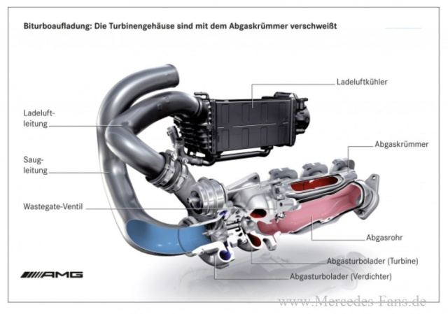 Zwei neben den Zylinderbänken angebrachte Abgasturbolader versorgen die acht Zylinder mit Frischluft. Bei einer Maximaldrehzahl von 185.000 Umdrehungen pressen beide Turbolader bei Volllast 1750 kg pro Stunde in die Brennräume. Der maximale Ladedruck beträgt 1,0 bar, in Verbindung mit AMG Performance Package 1,3 bar. Durch ihre spezielle und kompakte Bauform die Turbinengehäuse sind mit dem Abgaskrümmer verschweißt ergeben sich nicht nur deutliche Platzvorteile, dies begünstigt auch das Aufheizen der Katalysatoren.