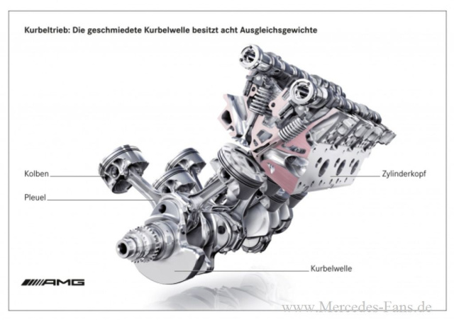 Das Kurbelgehäuse des neuen AMG 5,5-Liter-V8-Biturbomotor ist als Vollaluminium-Bauteil in Druckgusstechnik hergestellt. Das niedrige Motorgewicht von lediglich 204 Kilogramm (trocken) ist das Ergebnis engagierten Leichtbaus und führt zu einer ausgewogenen Gewichtsverteilung des Fahrzeugs. Der Lagerdeckel für die Kurbelwellenhauptlager besteht aus Grauguss und ist im Sinne hoher Steifigkeit mit dem Kurbelgehäuse verschraubt. Eine geringe Reibung der acht Kolben stellen die eingegossenen Silitec-Laufbüchsen sicher. Mehr Leistung und weniger Verbrauch bei Teillast bewirken die Pulsationsbohrungen im Kurbelgehäuse: Oberhalb der Lagerstühle befinden sich Längsbohrungen, die die neben-einander liegenden Kurbelräume verbinden. Üblicherweise wird durch die Auf- und Abwärtsbewegung der Kolben Luft in die Ölwanne gedrückt und wieder angesaugt was zu einer Erhöhung der inneren Reibungsverluste und damit zu einem Verlust von Motorleistung führen würde. Die Pulsationsbohrungen verhindern dies, indem sie für einen wirksamen Druckausgleich zwischen den Kurbelräumen sorgen.
