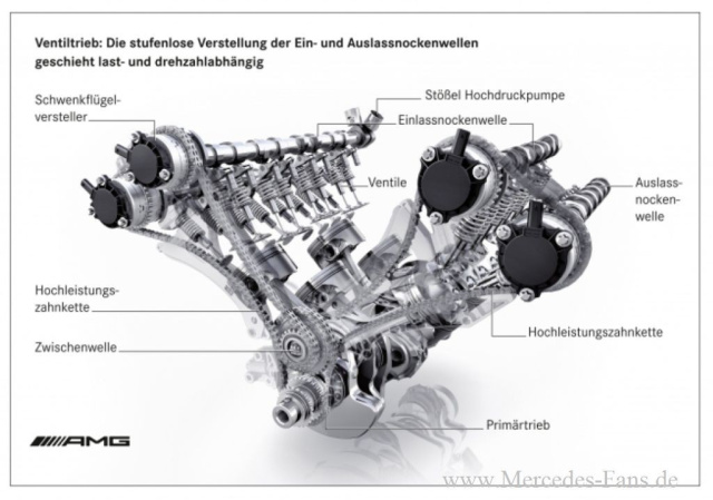Die Steuerung der variablen Nockenwellenverstellung erfolgt elektromagnetisch über vier so genannte Schwenkflügelversteller und wird vom Motorsteuergerät geregelt. Drei Hochleistungszahnketten übernehmen die Nockenwellenbetätigung, sie bieten im Vergleich zu Zylinderrollenketten deutliche Vorteile beim Geräuschkomfort.