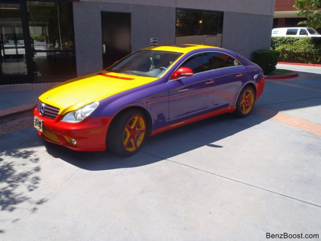 "Einmal Mercedes CLS 550 mit allem, bitte!" Diesen Wunsch hatte eine amerikanische Mercedes-Fahrerin. Es verlangte ihr für den CLS 550 aber nicht nach Stylingzubehör oder PS. Auch Chrom und Leder standen auf der Wunschliste nicht oben, sondern ganz viele bunte Farbe. Nein, Sie haben keine Farbsehstörung. So flippig koloriert wie ein Karnevalskostüm sieht der Mercedes tatsächlich aus. Da wird jeder Zirkusclown neidisch. Hmh, über Geschmack kann man bekanntlich nicht streiten. Und eines steht freilich fest: Dieser Mercedes-Benz ist einer wie keiner. (Bildquelle: Benzboost.com)