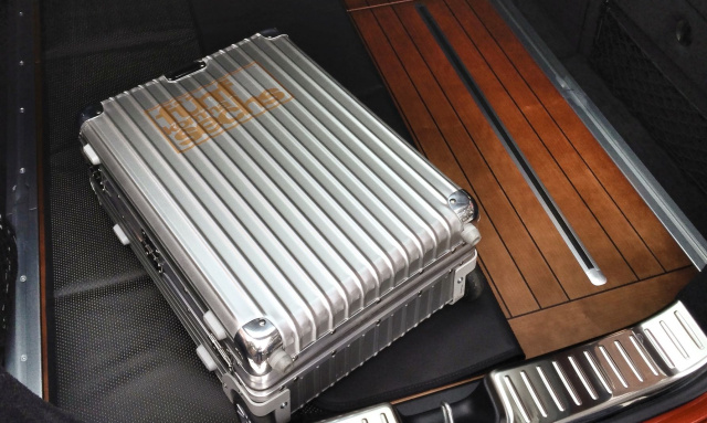 Falls der Erstbesteller sein Kreuzchen beim Sonderausstattungscode B27 gemacht hat, kann man seinen Rimowa auf einem Ladeboden aus affenporigem amerikanischem Kirschbaumholz, verziert mit edlen Aluminiumschienen, ablegen – fast wie an Bord eines Riva Bootes. (Oder Simca 1501 Break Anm. der Redaktion).