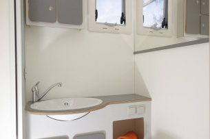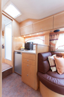 Innen bietet der EX 510 je zwei quer angeordnete Schlafplätze im Alkoven über dem Fahrerhaus und im Heckbereich. Gegenüber dem Küchenblock ist die mit Sicherheitsgurten ausgestattete Vierer-Sitzgruppe angeordnet. Sie kann ebenfalls zum Ruhelager umgebaut werden, als weitere Liegestatt für zwei Personen.