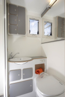 Für die bis zu sechsköpfige Besatzung des EX 510 gibt es ausreichend Stauraum, auch das Kühlvolumen des Absorber-Kühlschrankes mit Frosterfach ist mit 190 Litern ausreichend dimensioniert. Der Frischwassertank fasst reichliche 475 Liter Wasser, in den Brauchwassertank passen 120 Liter. Die Aufbaubatterie verfügt über eine Kapazität von 220 Ah und ist mit einem 1.800 W leistenden Sinus-Wechselrichter und einem Ladebooster gekoppelt. Für mildes Raumklima und fließendes Warmwasser sorgt eine mit Diesel betriebene Truma Combi-Heizung.