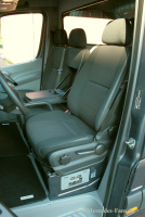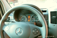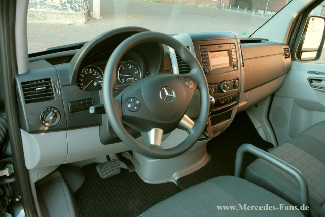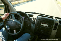 Das Interieur ist ebenfalls aufgewertet worden. Die Sitze sind neu gepolstert, nur die Sitzauflage kommt für Menschen ab 1,85 Meter zu kurz. Das dicke Lenkrad und der neu gestaltete Schaltknauf sind griffiger. Auch in Sachen InCar-Entertainment holt der Sprinter auf. Die neuen CD-Radios mit Bluetooth-Telefonie und und Navigationssystem Becker Map Pilot sind nun an Bord des Transporters.