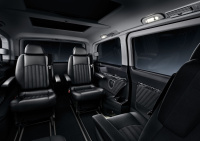 Im Fond reisen die Fahrgäste auf vier Einzelsitzen, ebenfalls mit einem gleichermaßen stilvollen wie behaglichen Lederbezug in Pfeifendesign. Auch diese Sitze verfügen über eine besondere Aufpolsterung mit erhöhtem Seitenhalt. Die Einsätze in den Seitenverkleidungen sind ebenfalls in Leder gehalten, die Dekorleisten in Wurzelnuss-Optik. Die schienengelagerten Einzelsitze sind in Schritten von 25 mm verschiebbar und haben integrierte Dreipunkt-Sicherheitsgurte, höhenverstellbare Kopfstützen und verstellbare Armlehnen.