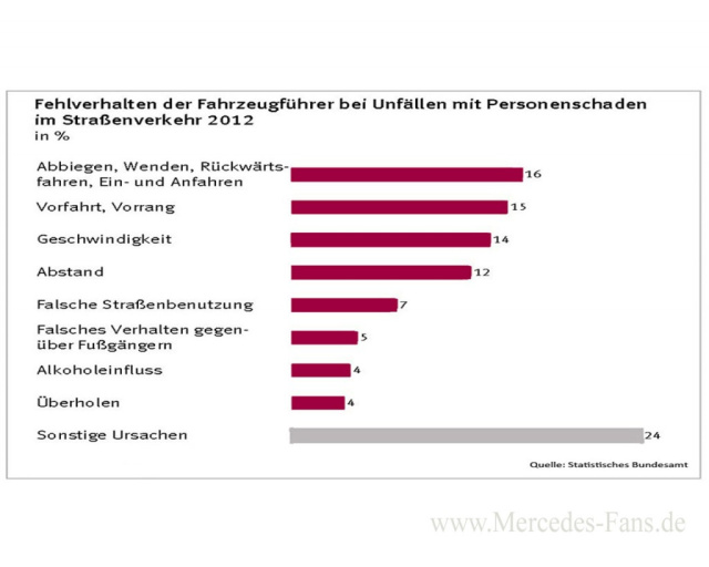 Bei lediglich 9,3 Prozent der Unfälle waren die Witterung, Straßenverhältnisse oder Wildtiere die Unfallursache. Wer will da noch anzweifeln, dass Fahrassistenten, wie Mercedes-Benz sie entwickelt und bereits in Fahrzeugen der Kompaktklasse anbietet, einen wichtigen Beitrag zur Unfallvermeidung und erhöhter Verkehrssicherheit leisten.