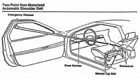 überstehen. Außerdem glaubte man, den amerikanischen Verbrauchern das aktive Anlegen von Sicherheitsgurten nicht zumuten zu können, daher waren automatische Gurtsysteme vorgesehen, die sich selbsttätig nach dem Schließen der Türen um die Frontpassagiere legten. Schrecklich! Glücklicherweise wurde dieser "Gurt-Anlege-Assistent" (siehe Bild links) bald wieder zu den Akten gelegt!