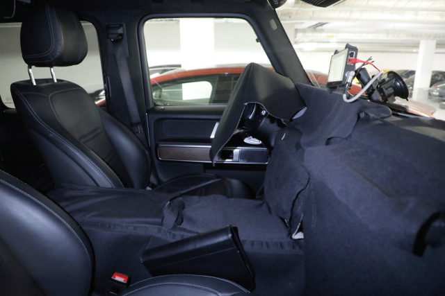 Dem Mercedes-Fans.de Erlkönigjäger war auch ein Blick in den Innenraum des G63 vergönnt. Die entscheidenden Stellen waren aber mit einem Sichtschutz belegt. Weil Lenkrad, Armaturenbrett und Mittelkonsole getarnt wurden, dürfen daraus schließen, dass der Innenraum des G-Klasse-Facelifts erheblich überarbeitet worden ist.